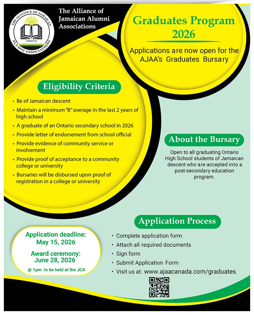 Open to all graduating Ontario High School students of Jamaican descent who are accepted into a post-secondary education program.